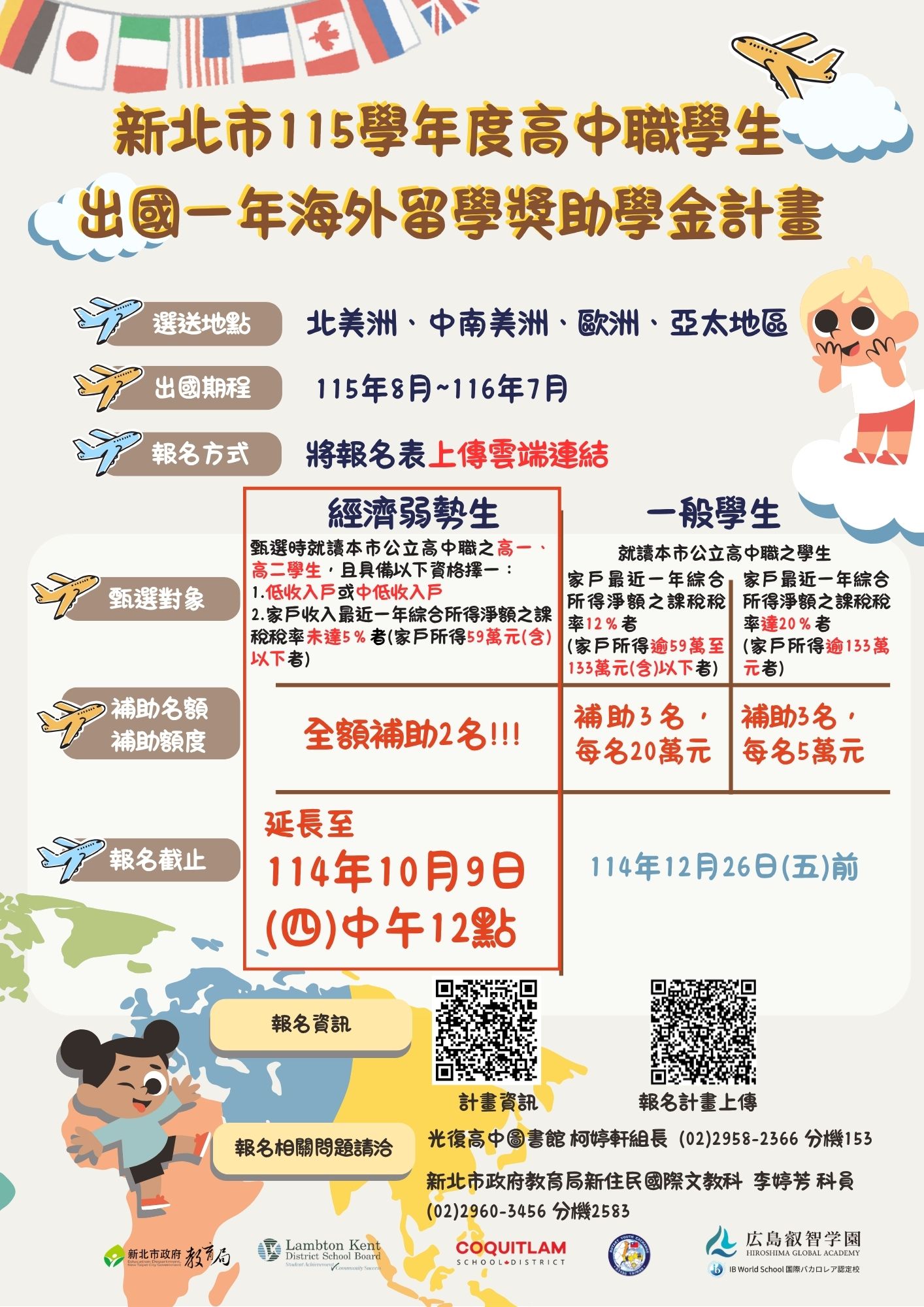 新北市115學年度高中職學生出國一年海外留學獎助學金報名簡章