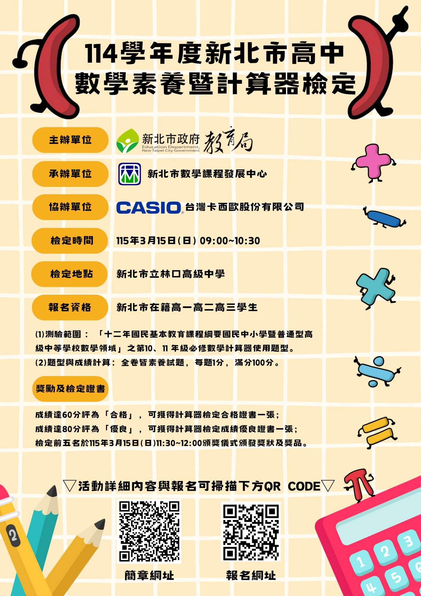 二、今年活動擴大辦理,新北市將與高雄市於115年3月15日(日)9:00~12:00同時進行檢定活動,北區考場地點訂於新北市立林口高級中學, 歡迎新北市在籍高一高二高三學生踴躍報名參加,詳細內容請參閱簡章如附件。