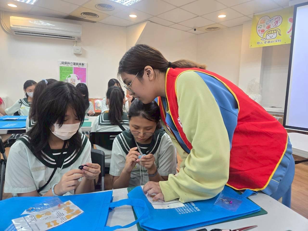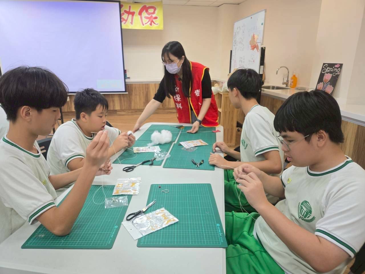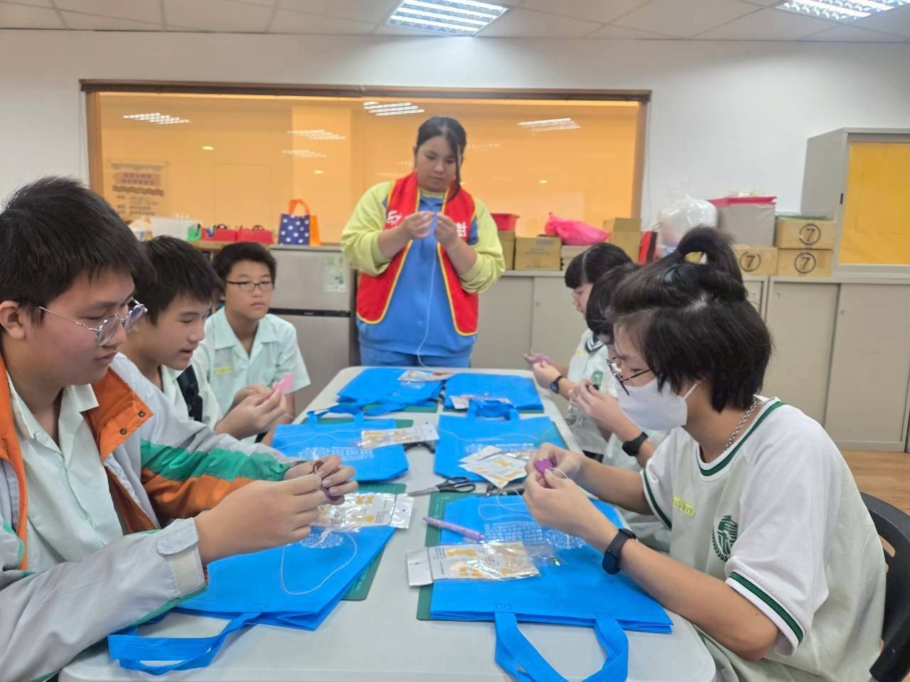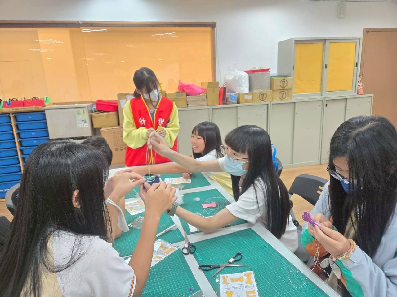 由我們的佳玲老師親自指導,帶領大家一步步學習如何利用線材縫出出可愛的狗骨頭吊飾。同學們一開始都顯得有些緊張,但在老師的示範與小天使們的協助下,漸漸熟悉了縫紉的技巧。大家一邊動手、一邊互相討論,教室裡充滿笑聲與專注的氛圍,這項活動不僅訓練了手眼協調與耐心,也讓大家體會到手作的樂趣與成就感。