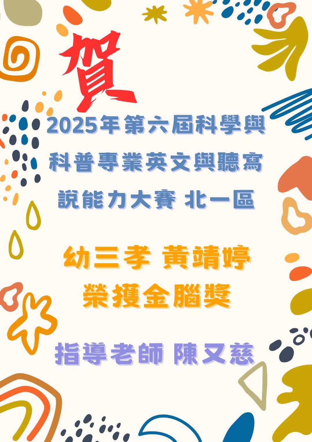 幼三孝黃靖婷 參加2025年第六屆科學與科普專業英文與聽寫說能力大賽 北一區 榮獲金腦獎🎉🎉