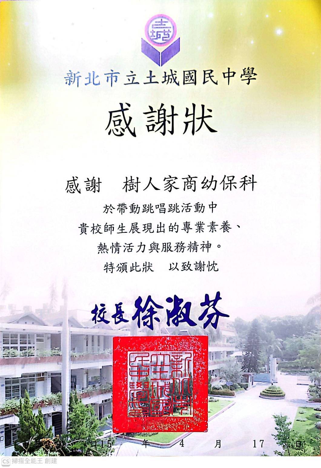 非常感謝土城國中徐淑芬校長的支持與邀請,讓我們有機會可以將所學與現場實務工作做結合!