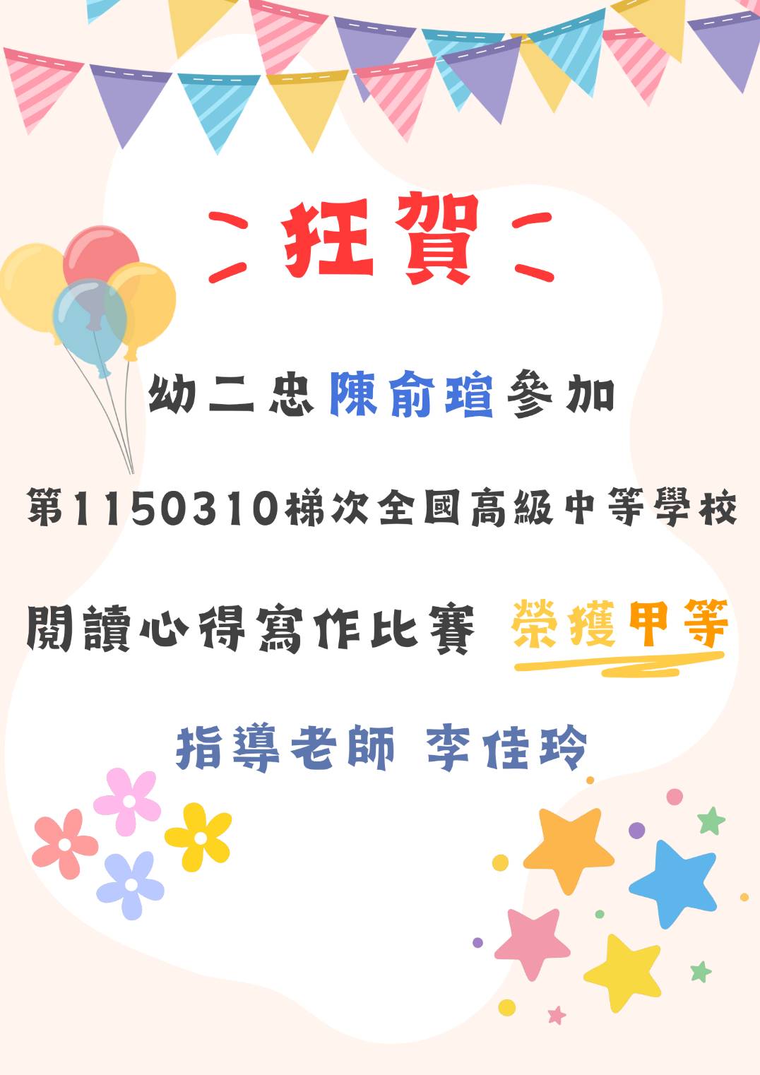 幼二忠陳俞瑄參加第1150310梯次全國高級中等學校閱讀心得寫作比賽,榮獲「甲等」殊榮。