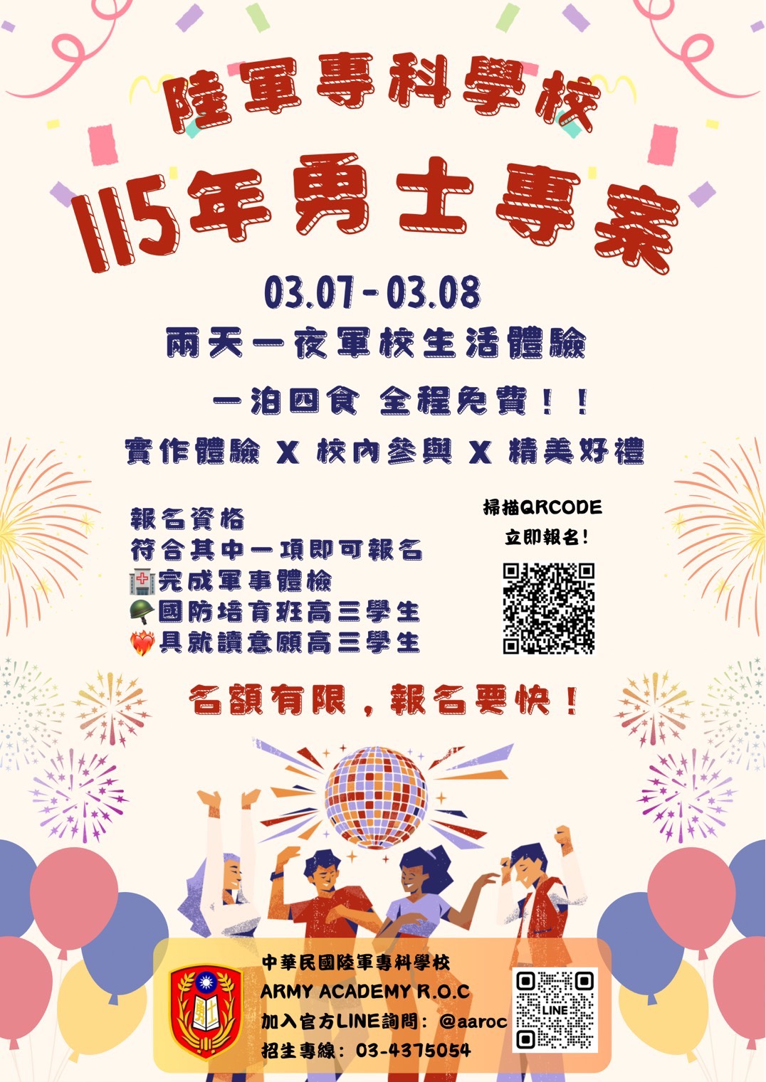 115年勇士專案開始報告嚕,1泊4食全程免費,2天1夜軍校生活體驗,走過路過千萬不要錯過喔!