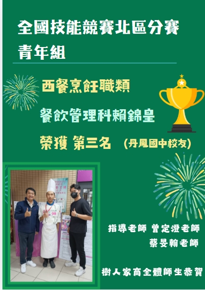餐飲管理科賴錦皇同學-「西餐烹飪」職類-第三名
