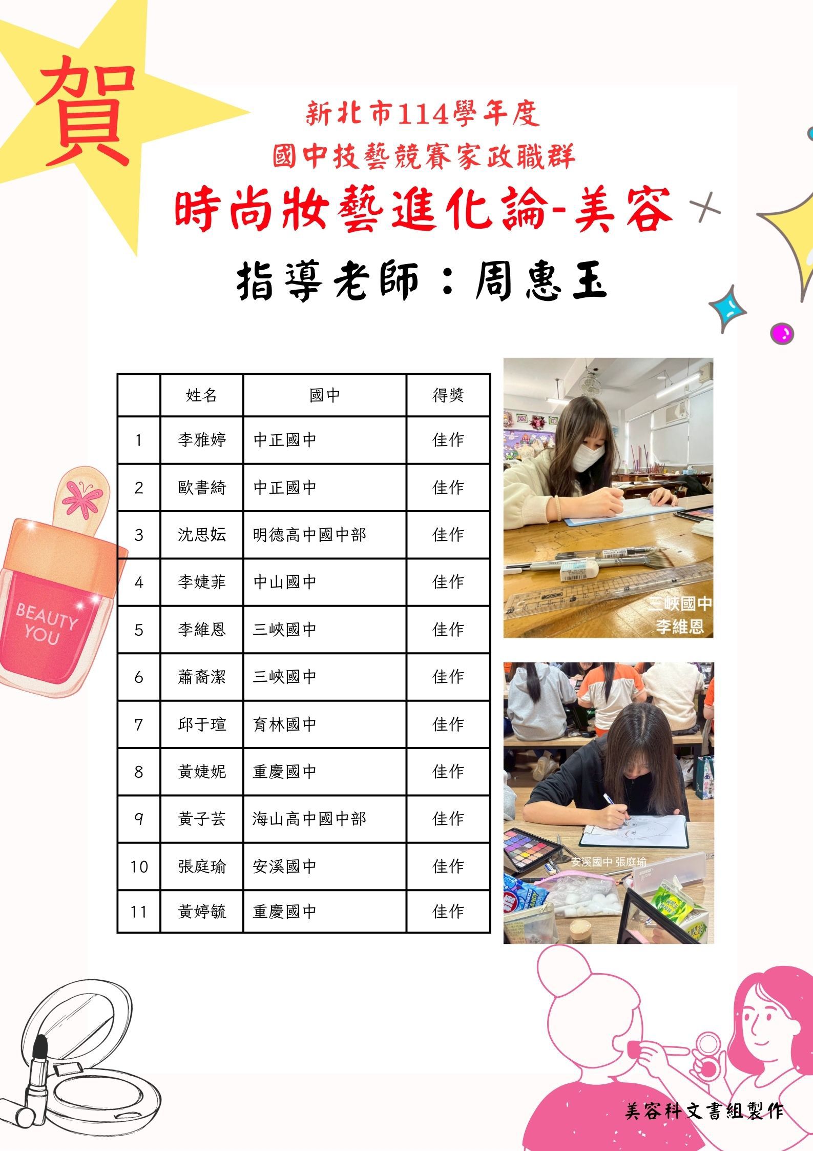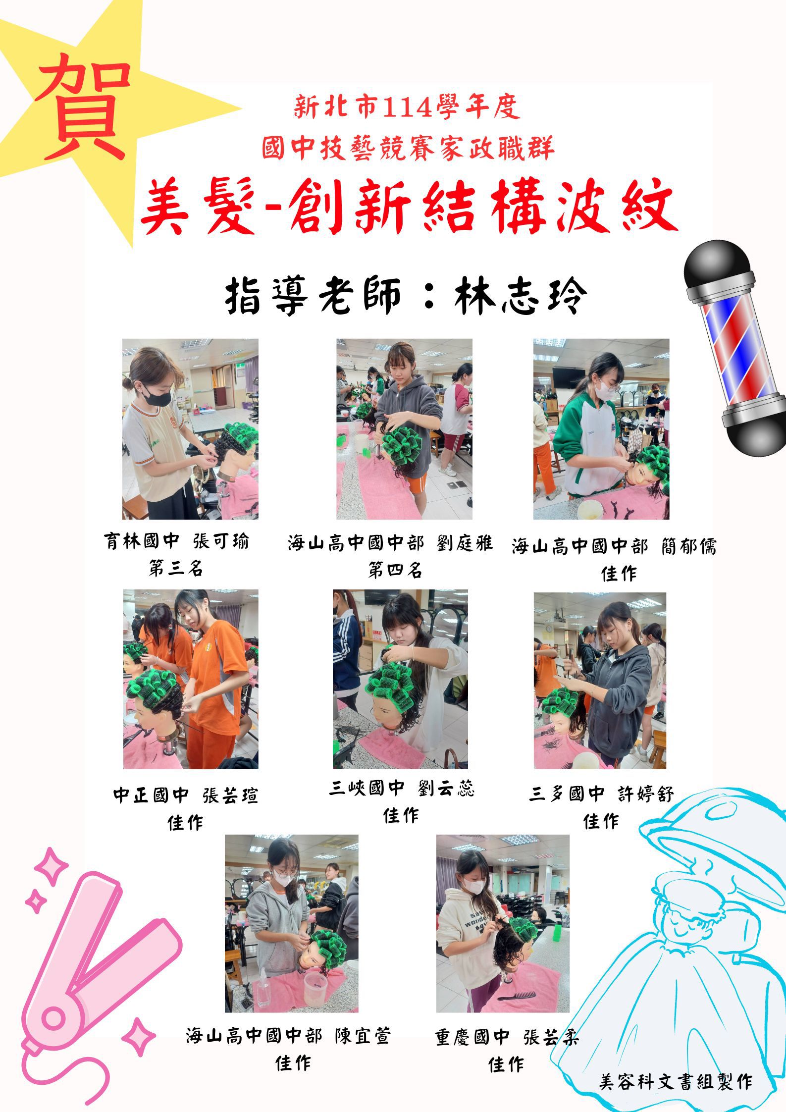 恭喜本校於 新北市114學年度國中技藝競賽家政職群 中表現亮眼,成果豐碩,閃閃發光!