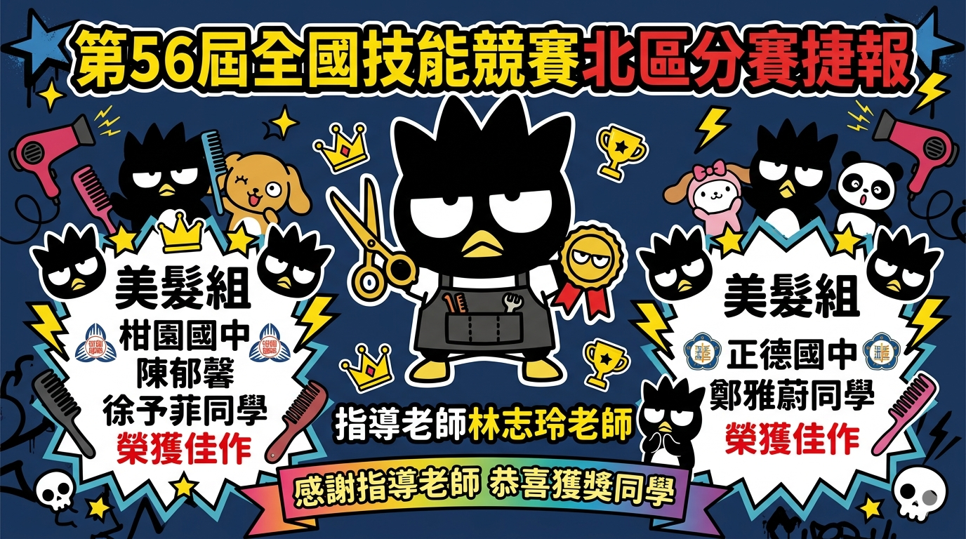 ~~~~~~第56屆全國技能競賽北區分賽捷報~~~~ 美髮組 柑園國中陳郁馨 徐予菲同學榮獲佳作 正德國中鄭雅蔚同學榮獲佳作
