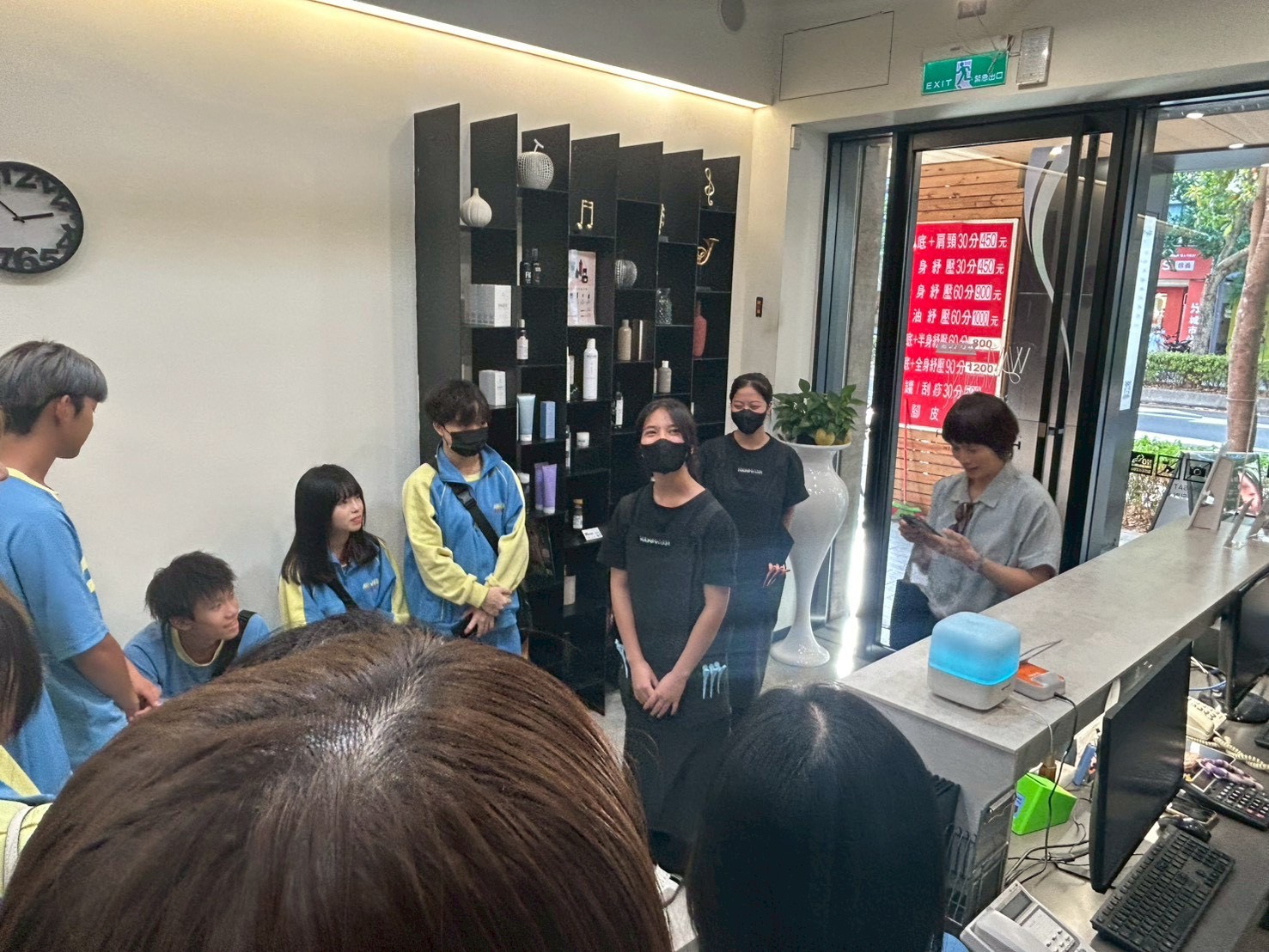 在業師的帶領下,同學們參觀了沙龍的接待區、設計區與染燙區,