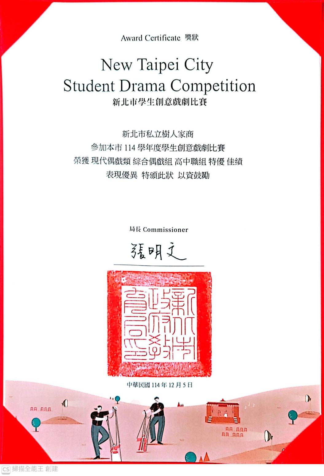 比賽前的緊張在彼此的鼓勵中轉化為力量,演出時每位同學都集中精神,把練習過無數次的細節確實呈現。當表演落幕、等待結果時,心跳比掌聲還清楚。最後聽見「樹人家商——特優!」那一刻,所有壓力、眼淚與努力,都變成最值得的回報。