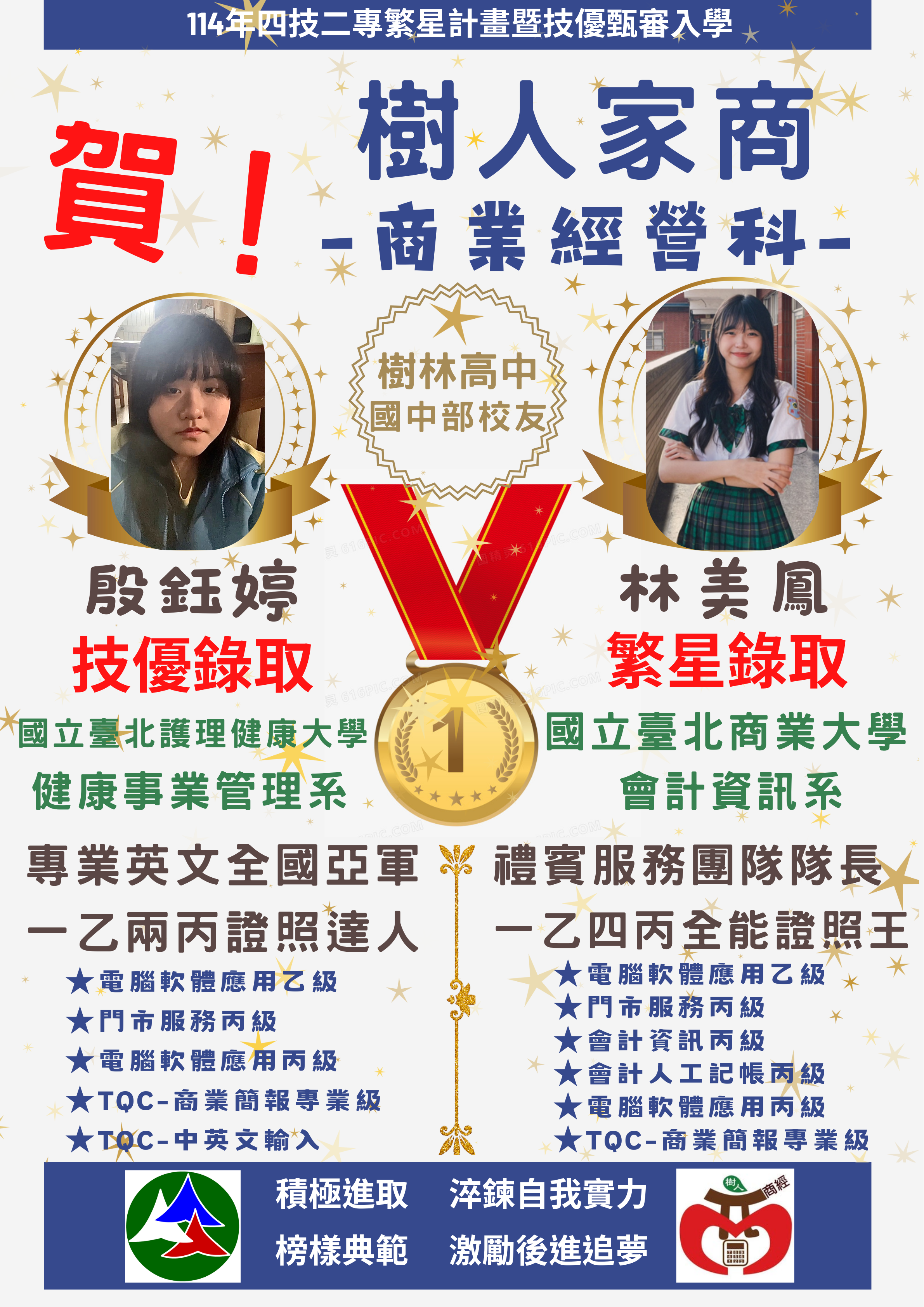 #樹人家商 #商業經營科 #繁星計畫 #技優甄審 #國立大學 #樹林高中國中部校友 #國九生