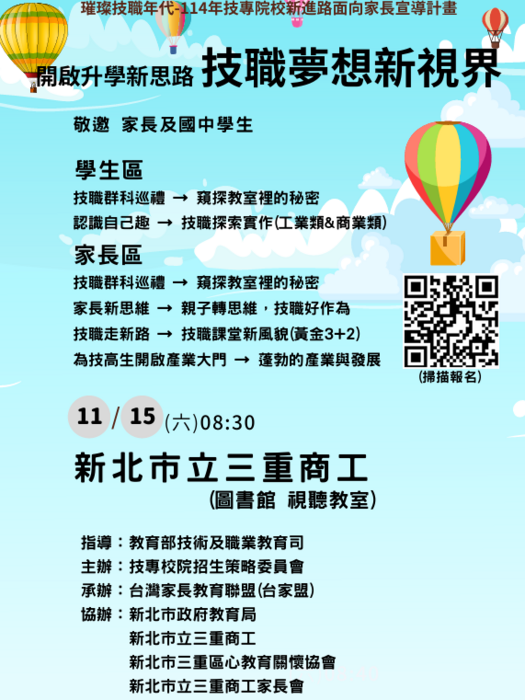 為增進學生及家長對技術型高中及科大階段的技職教育課程內容、學習環境與未來升學進路有進一步認識,並能了解技術型學校如何與產業需求緊密結合以銜接職場發展,培育務實致用的各行業專業人才,台灣家長教育聯盟邀請技術型高中及技專院校教師現身說法,並規劃職涯探索活動,提供學生及家長充分掌握技職教育的多元面向與發展前景。