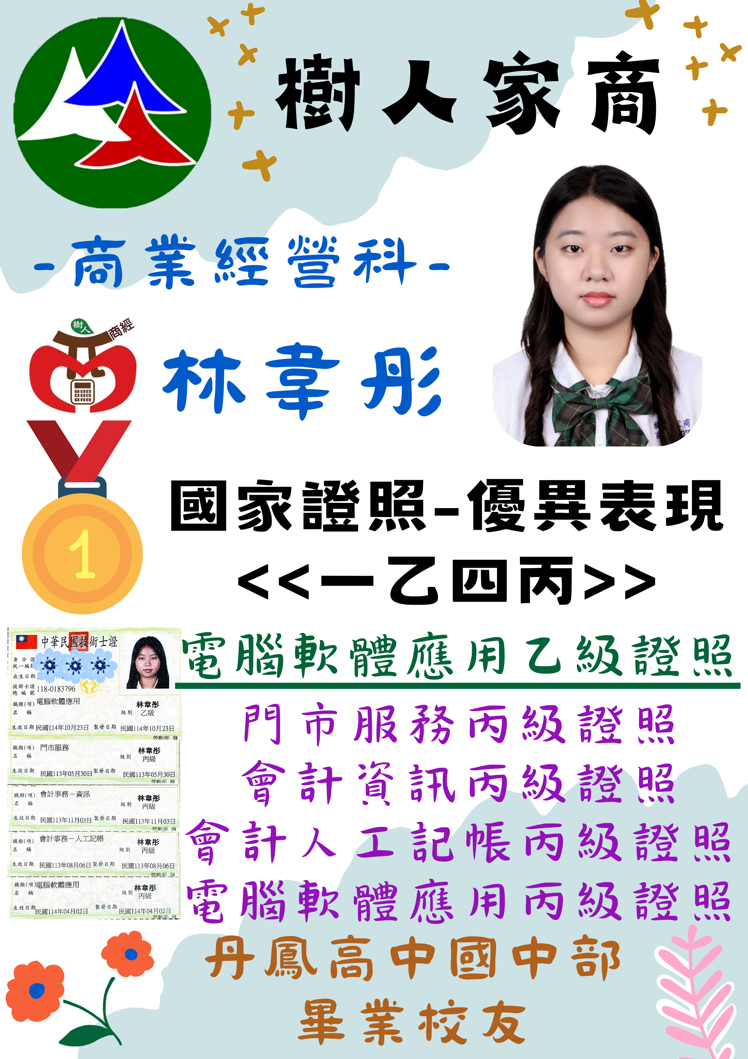 國家證照優異表現--商業經營科林韋彤「一乙四丙」