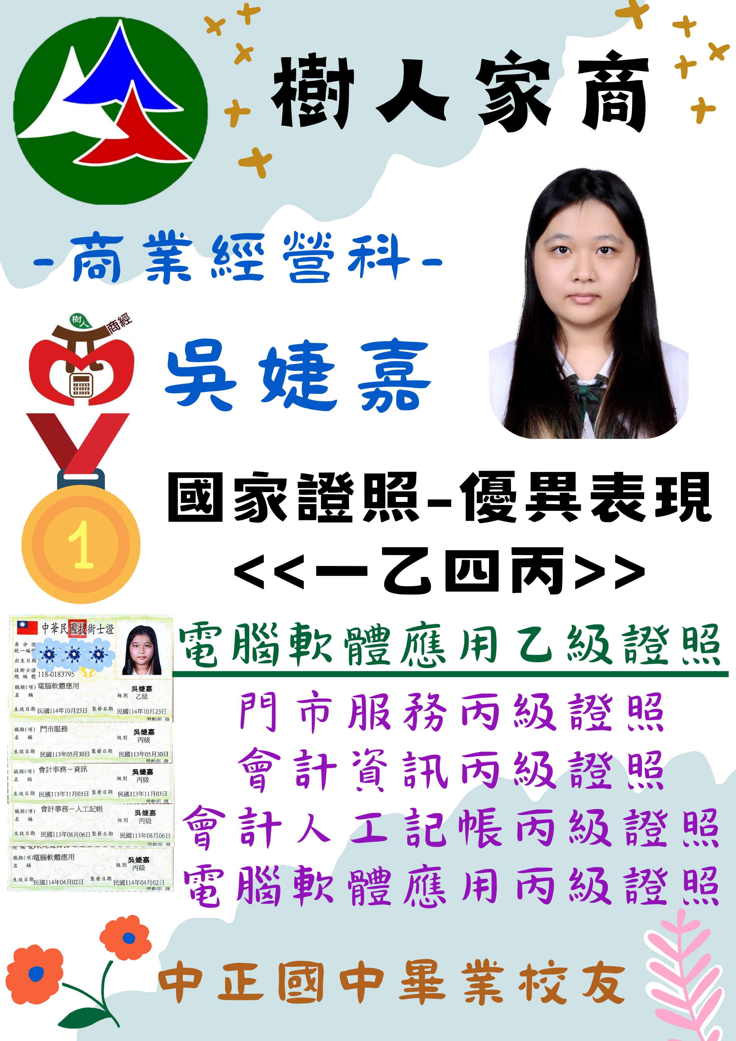 國家證照優異表現--商業經營科吳婕嘉「一乙四丙」